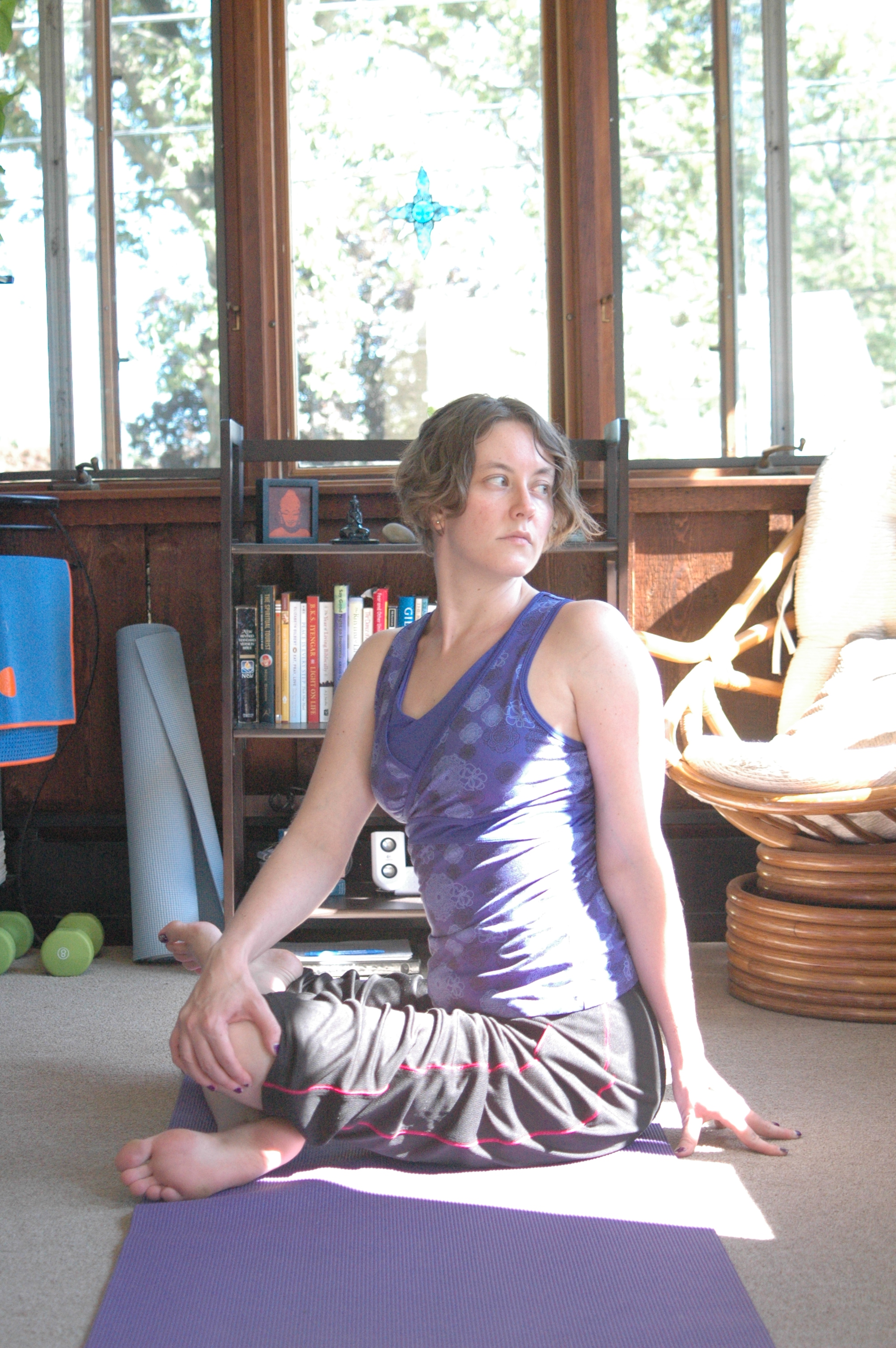 I first learned this little twisting sequence from a teacher at Yoga on Main in Manayunk and I practice it frequently. I like how it combines a twist with a side stretch and a forward fold, neatly and economically stretching a variety of muscles. I appreciate the simplicity of the leg position that makes the pose accessible to students at any level. My mind stays engaged as I move through the variations, and I find the forward fold at the end gives a feeling of completion.